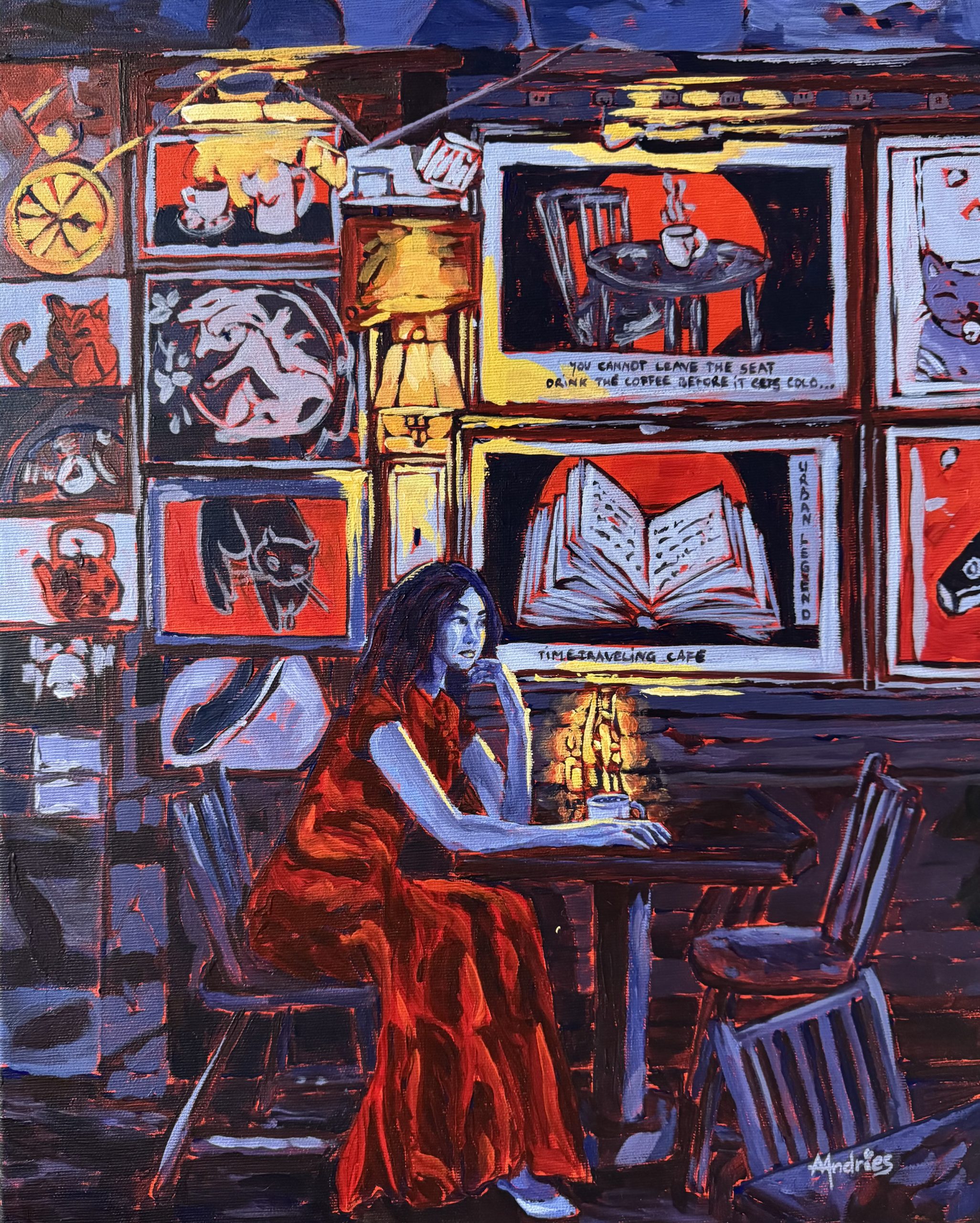 I intended this painting as a quiet echo from another time, suspended between memory and imagination. Inspired by “Before the Coffee Gets Cold” it portrays the woman who can never leave her seat, forever caught in the space between regret and remembrance.