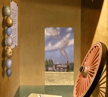 According to the artist’s son, this piece depicts a strangely still world: “Life seems to have halted and become frozen like the locomotive itself in front of a chance or imaginary obstruction.”.