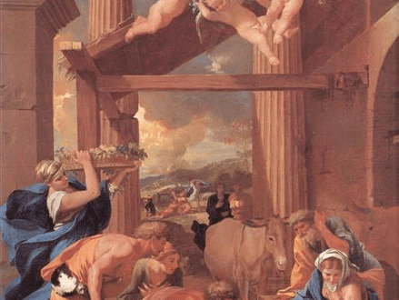 Portrait of the Adoration of the Shepherds by Nicolas Poussin (1594–1665) is a painting that now hangs in London’s National Gallery (Room 19). A work of art, it’s an oil painting on canvas that measures 97.2 by 74 centimetres (with uneven edges). The lower right stone is signed “N. Pusin.fe” [“fecit”]. This is unusual for Poussin. Cardinal Gian Carlo de’ Medici, the second son of Grand Duke Cosimo II of Tuscany, purchased the painting in 1637 and had it installed in his villa outside Florence.