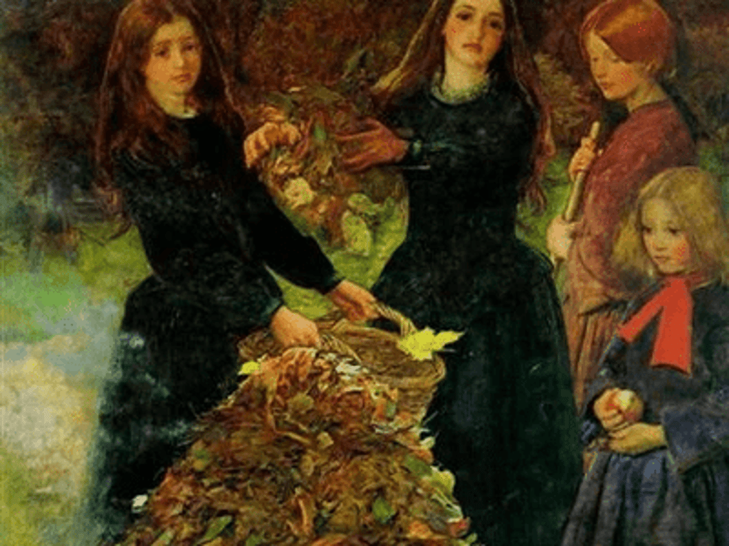 John Everett Millais’s Autumn Leaves (1856) was shown at the Royal Academy of Arts in 1856. The critic John Ruskin referred to it as “the earliest instance of a wonderfully painted twilight” in his writings. Effie Millais noted in her husband’s diary that he wanted to paint a picture “full of beauty and devoid of a theme”.