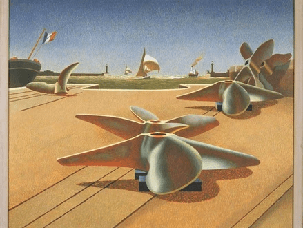 Paintings like this one by Wadsworth are common throughout his work. Attributing life to inanimate objects was something he was fascinated with. Propellers aboard ships in the harbour convey movement and hint at the purpose they will serve beyond the lip of the bay.