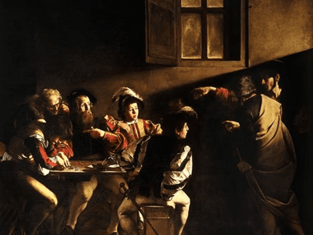 In the Gospel of Matthew, Matthew 9:9, “Jesus saw a man named Matthew at his seat in the custom house, and said to him, ‘Follow me,’ and Matthew rose and followed Him.” The painting depicts this storey. Matthew the tax collector sits at a table with four other men depicted by Caravaggio. He’s pointing at Matthew, and he’s joined by Jesus Christ and Saint Peter. The faces of the men at the table are illuminated by a beam of light as they gaze at Jesus Christ.