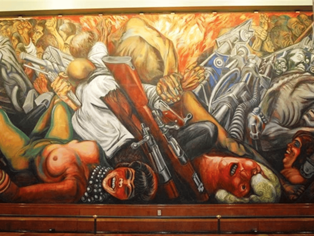Palace of Fine Art in Mexico City houses Catharsis (1934), a large mural depicting a cathartic experience. A dystopian vision of humanity is depicted there by Orozco, which is riddled with conflict, decay and destruction. It is in this context that he depicts an industrialised and war-ravaged world, with protesters, men in combat, and piles of cogs, weapons, and machinery as the backdrop. On her back, provocatively, a laughing prostitute lies to the left of the mural’s centre. Disembodied heads of other prostituted women, their grimacing faces painted with garish makeup, are also included by Orozco in the background.