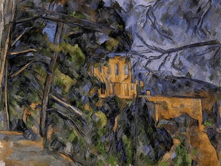 Foreboding images were inspired by the house’s decrepit isolation. As with the Bibémus rocks, the eerie structure seen in Château Noir, circa 1900–1904, is partially obscured by pines. The scene is made all the more powerful by Cézanne’s saturated palette of dark greens, blues, and others.