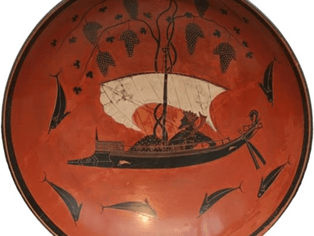 While the rudder is clearly visible at the back, the ship’s prow is adorned with an animal head. There is a large statue of Dionysus, the god of wine, inside the ship. Unlike the other parts of the image, the sail in the black figure style is painted white. With three large clusters on one side and four on the other side, vines grow from the mast.