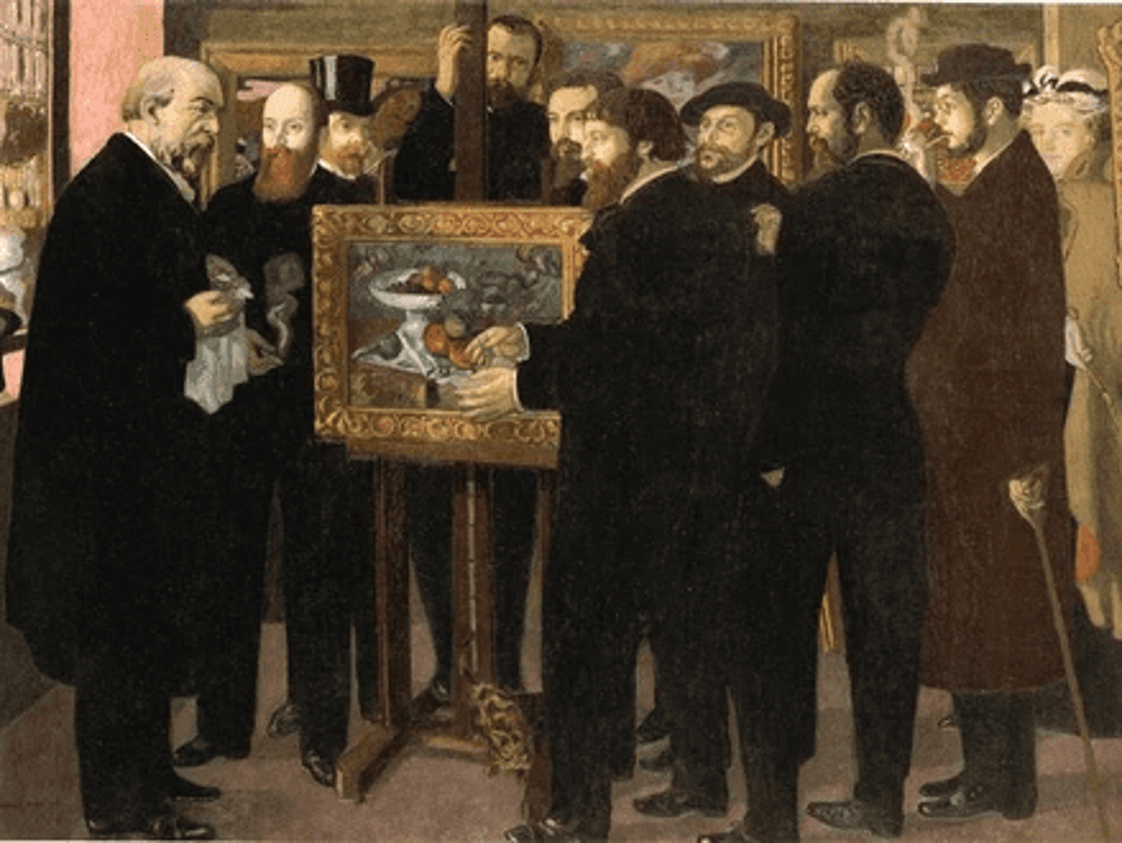 At the centre of this painting is an easel with an 1879–80 still life depicting a fruit bowl filled with apples by Paul Cézanne, which Maurice Denis has assembled a group of people to celebrate. The setting is Ambroise Vollard’s gallery in Rue Laffitte.