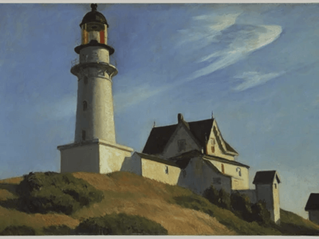 Hopper uses a dramatic silhouette of a lighthouse against a clear blue sky to create this piece. Architecture in Cape Elizabeth, Maine, where it is located on a rocky outcrop, receives a mixture of direct sunlight and deep shadows.