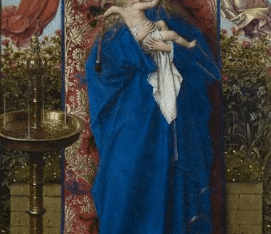 Jan van Eyck’s 1439 oil on panel painting, The Madonna at the Fountain, is a classic example of early Netherlandish art. This is van Eyck’s final signed and dated painting, dating from his late career. IXH CAN, “JOHES DE EYCK ME FECIT + [COMPLEVIT ANNO 1439]” are the inscriptions on the original frame.