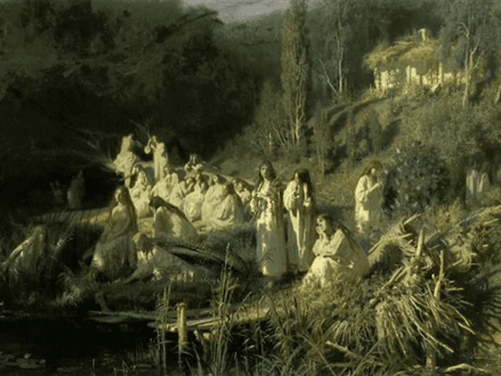 Russian artist Ivan Kramskoi made this painting in 1871. It’s called “The Mermaids,” or “Drowned Maidens,” in English. In Slavic mythology, rusalki were river or lake spirits who took the form of young women at night. This painting shows 19 of them. According to some of the myths, they were spirits of people who had died without being baptised, married, or had drowned themselves because they had been in love with someone who didn’t want to be with them. They would come out of the water at night and sing and dance. Similar to sirens, they enchanted young men and then led them to drown in the water.