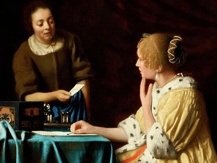 The shadow of the table on her legs shows that the light is coming from the left. This painting may look simple at first, but it has deeper psychological meanings that aren’t always clear. If you look at the picture straight on, you see the mistress as she looks at the sealed love letter, which suggests that she is in a relationship with someone who is probably a long way away.