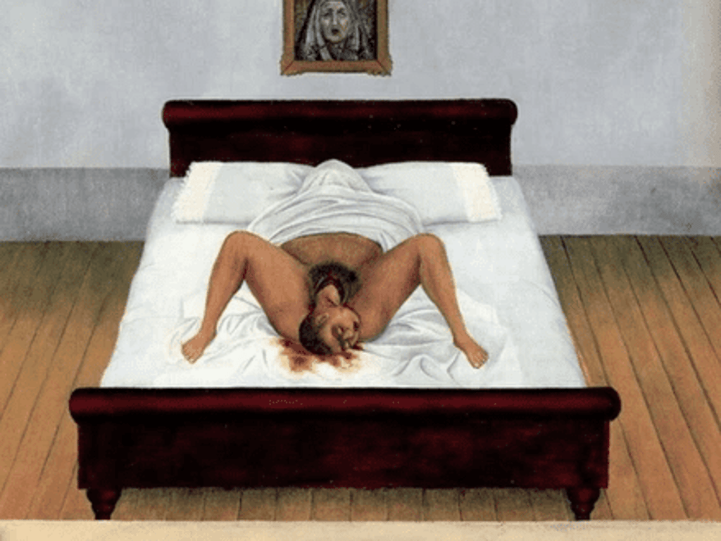 Both the mother and the child appear to have died in this haunting painting. The mother’s head is covered in a white cloth as she gives birth, and the newborn appears to be dead.