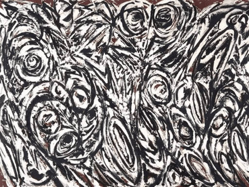 The tangle of mostly black and white brushwork reveals menacing (disembodied) eyes and heads. The painting’s rich surface texture, dense interlocking forms, and suggestive and ominous nuances of imagery combine to create a sombre and eerie effect.