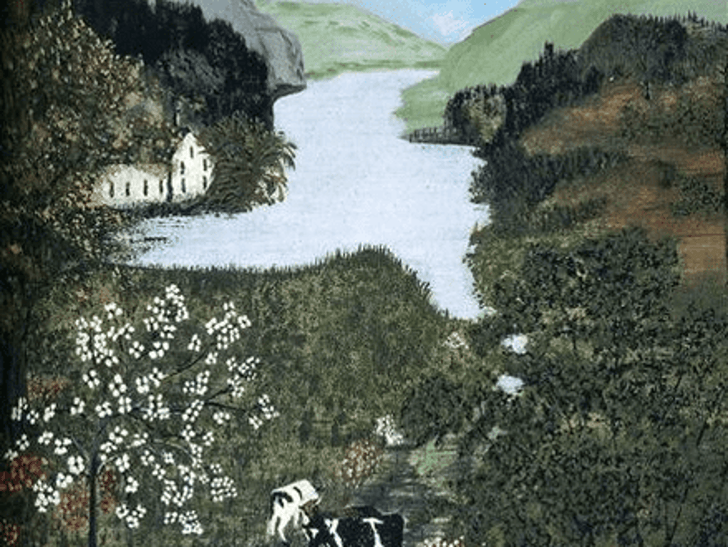 The Shenandoah Valley in Virginia’s Shenandoah Valley is depicted in this painting by Grandmother Moses. Since the scene is so lifelike, it appears as though it was created by using a collage technique with real foliage. In the foreground, three cows graze alongside a wooden rail fence in lush green fields and flowering trees. In the distance, a picture-perfect white house sits on the bank of a river, and the horizon continues to flow into a distant mountain range even further back.