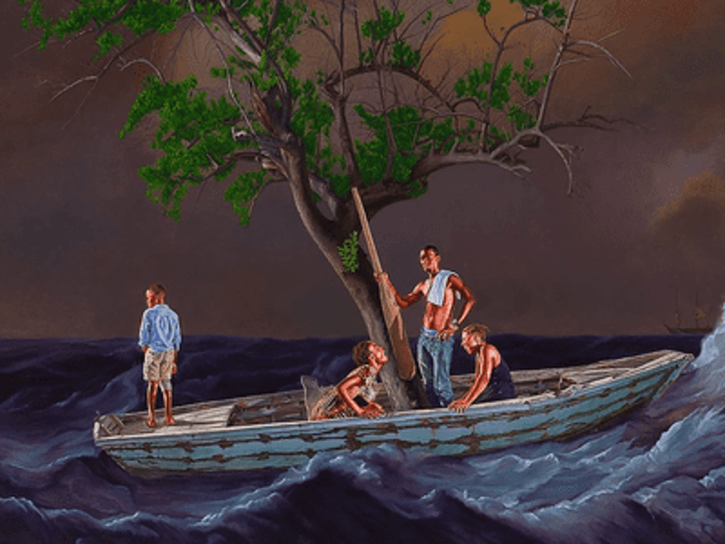 Four young black guys are shown in this artwork rowing a decrepit rowboat over a rough sea. A storm is brewing, as shown by the dark, black, and orange hues in the sky. A solitary tree with green leaves sits in the middle of the boat. One of the guys is bare-chested and wearing blue trousers, carrying an oar in each hand. On each side of him, two guys seem to be arguing and/or laughing loudly. The fourth guy is seated at the rear of the boat, facing away from the viewer and gazing out at the choppy waters.