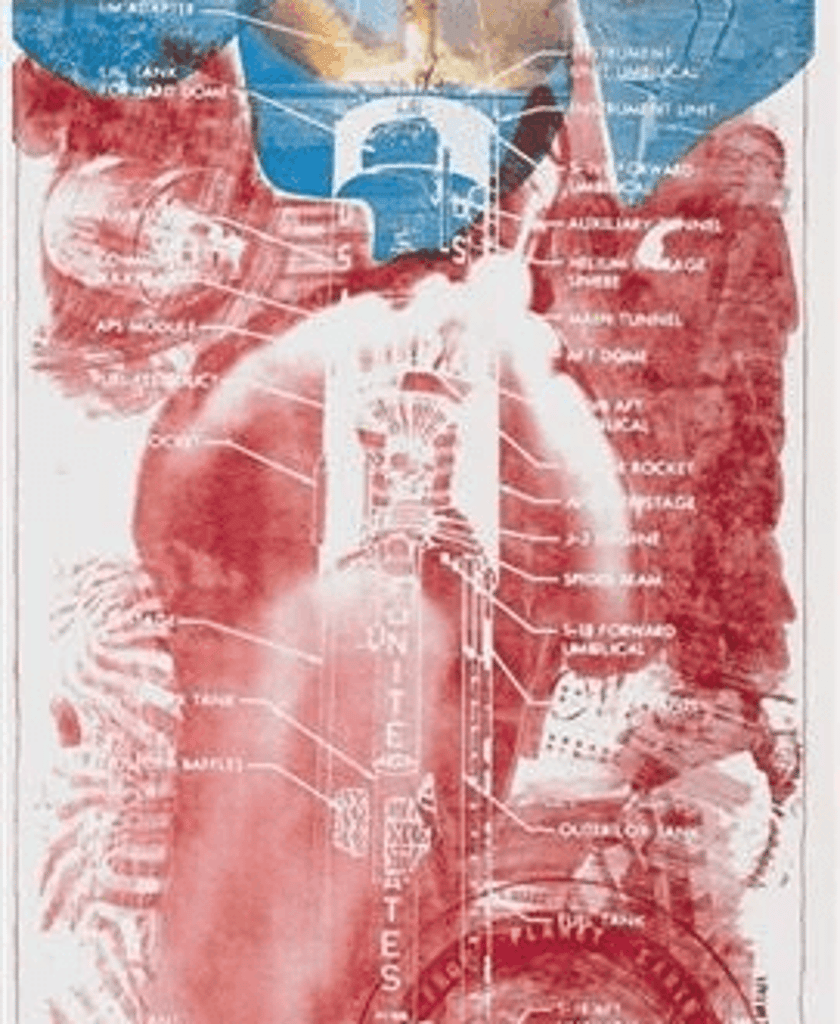 With space travel becoming a possibility by 1969, Rauschenberg and many Americans were excited by the promise for human-technological partnership that may be achieved through space travel.