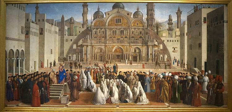 Located in Milan’s Pinacoteca di Brera, Gentile and Giovanni Bellini’s oil painting St. Mark Preaching in Alexandria dates from 1504–07.