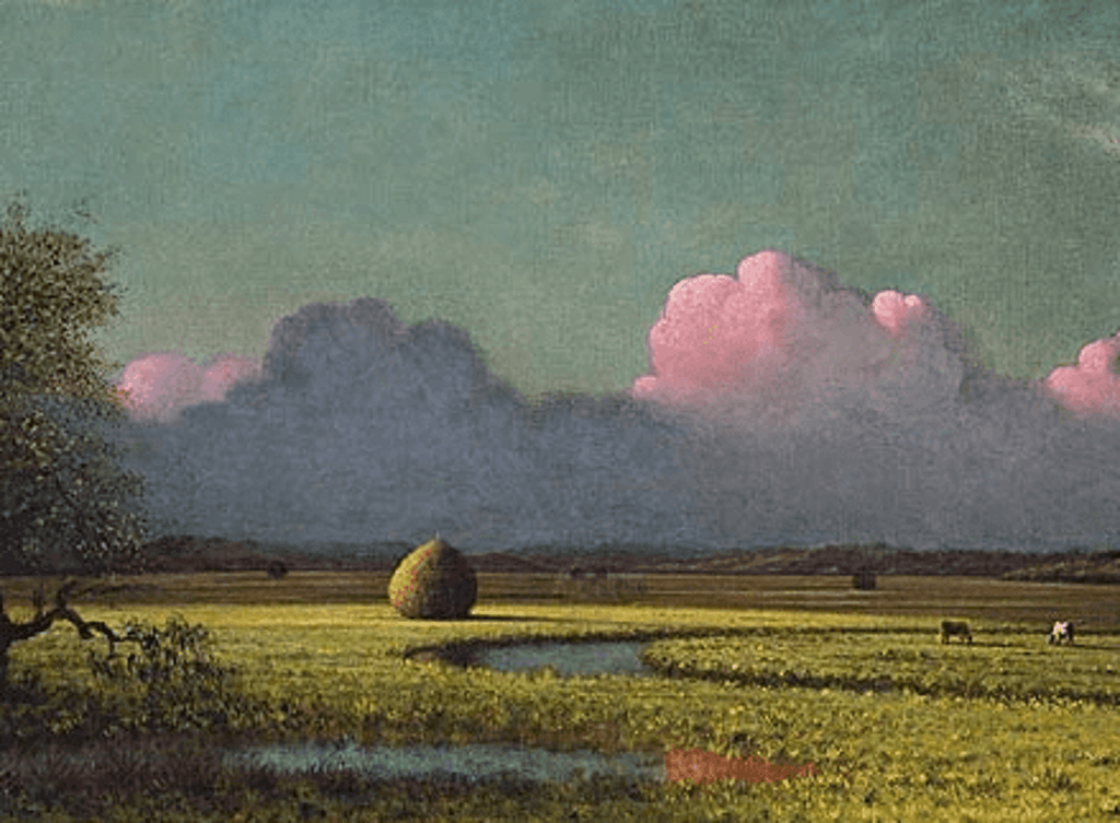 According to the National Gallery, “Heade depicted the tides, meteorological phenomena, and other natural forces that shaped the swamp’s appearance and showed how the land was used for hunting, fishing, and the harvesting of naturally occurring salt hay… the painting’s primary motif, sunlight and shadow, seen, for example, in its intricate cloud shadows and the subtle movement from light to dark across the body of the haystack, informs and unites.”