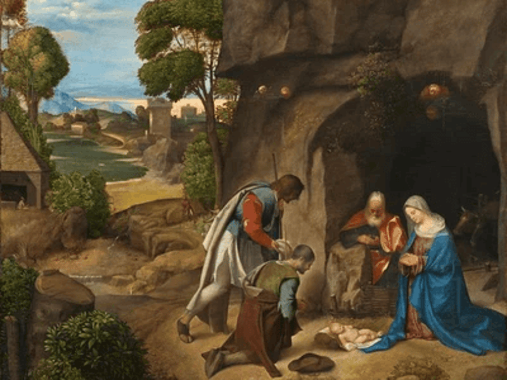Giorgione, an Italian Renaissance painter, finished The Adoration of the Shepherds in 1505–1510. The painting is sometimes still referred to as the Allendale Nativity, after a previous owner. Although the attribution is now generally accepted, it is not universally held; the other common opinion is that it was painted by an early Titian. Without a doubt, it is a work of art from the Venetian school. This piece is on view in the National Gallery of Art in Washington, D.C.
