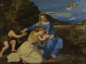 Giorgione presented the primary scene on the right, in front of a gloomy grotto, while on the left is brilliant landscape capped with trees. The placement of the knelt shepherd pilgrims in the middle of the painting creates a genuine dramatic tension. Together, the parents, child, and pilgrim make constitute a centred rectangle that acts as a counterpoint to the fading countryside on the left.