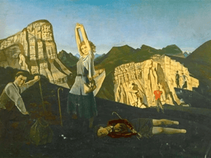 The painting is an almost photographic depiction of a single moment, lacking any narrative. It’s a study in greys, blues, and black, with the blazing red of heated metal as a punctuation mark. The figures’ complementary gestures help to keep the composition in balance.