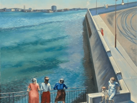 The expressions of the three women in the foreground are hidden from the observer, adding to the uncertainty caused by the strong contrast between natural and man-made environments.