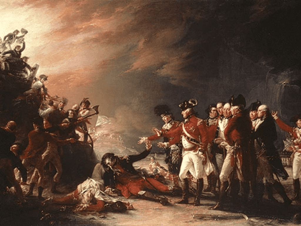 The night of November 26, 1781, when British troops launched a surprise attack (sortie) against the enemy batteries, is depicted in the painting. The painting’s central theme is the death of Spanish officer Don Jose de Barboza. After being abandoned by his troops, he died of his wounds while refusing help. General George Elliott, the British army’s commander, portrays him as turning down his assistance.