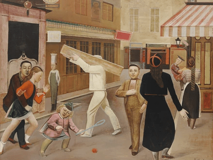An allegory of early painters such as Bosch and Brueghel’s outdoor group scenes can be seen in this tableau of urban life, which depicts a larger group of people than the more intimate couples or single individuals he usually painted. A combination of Surrealism’s mysterious effects, stiff postures and elevated atmosphere, as well as classical composition of figures in architectural space, is used to update this depiction of shared (or parallel) sociality. Using some of the techniques of Renaissance-era painting, he creates a vanishing perspective for the viewer by foreshortening the individual figures at their various depths in a precise layout of proportions. Otto Dix’s ambiguous portraiture and Max Beckmann’s group tableaus in modern spaces were both produced at the same time, but Dix’s work is more refined.