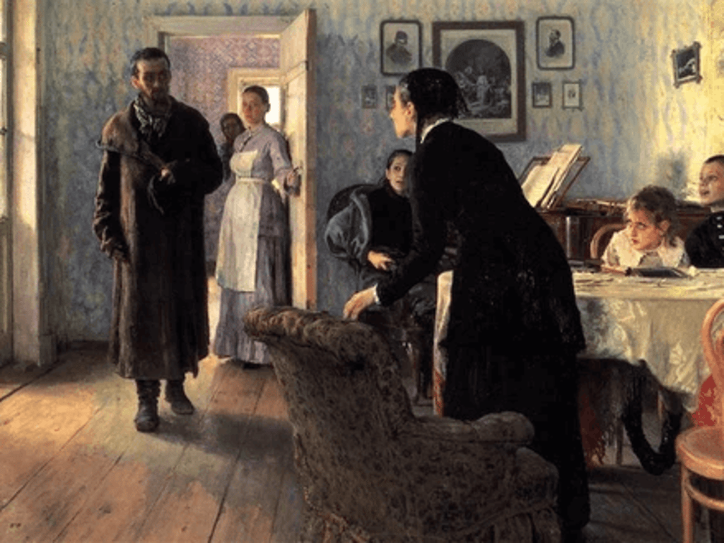This is the second adaptation of “The Unexpected Visitors,” and by far the most popular one. Repin painted the first one in 1883, and both its scale and the number of figures were drastically reduced from later paintings (the main character was a girl accompanied by a woman and two more girls, supposedly her mother and sisters).