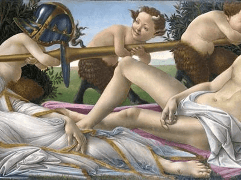 About 1485, the Italian Renaissance painter Sandro Botticelli created a panel painting entitled Venus and Mars (or Venus and Mars). Allegorically, it depicts the Roman deities Venus (goddess of love) and Mars (goddess of war). In the midst of a forest full of frolicking baby satyrs, a young and sensual couple reclines on a log.