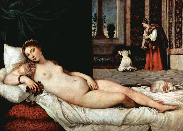Based on the Dresden Venus, generally assigned to Giorgione but at least finished by Titian. Titian has domesticated Venus in this painting by bringing her inside, creating eye contact with the spectator, and emphasising her sexuality. With no classical or allegorical trappings, the image is sensuous and unashamedly carnal – Venus exhibits none of the characteristics she is intended to embody.
