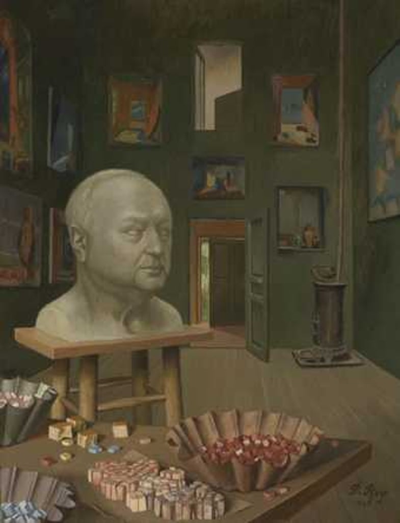 At a glance, this is portraiture: a painting of an imagined carved likeness. In it, Pierre Roy transforms his friend and colleague, mosaicist Boris Anrep, into stone. Roy achieves a sense of monumentality for the bust, which appears to tower over the studio behind it through a characteristic manipulation of perspective. Despite the solemnity and restraint of the painted sculpture, Roy’s perspective creates an odd effect similar to a cinematic zoom in which an object is suddenly brought into dramatic focus.