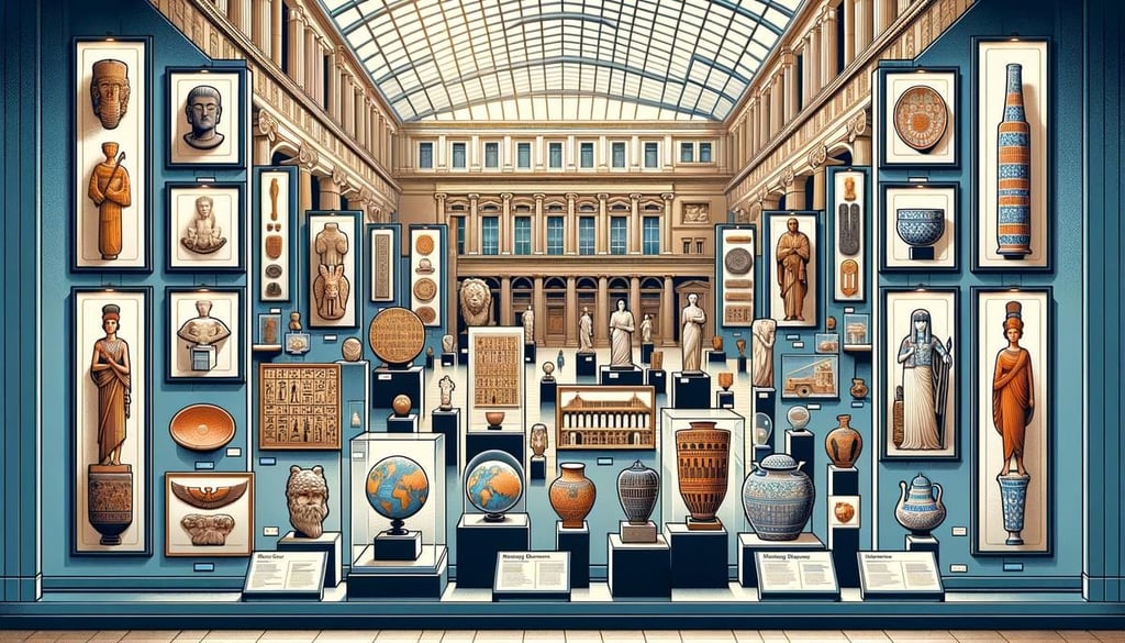 A variety of ancient artifacts from different cultures displayed in a museum setting