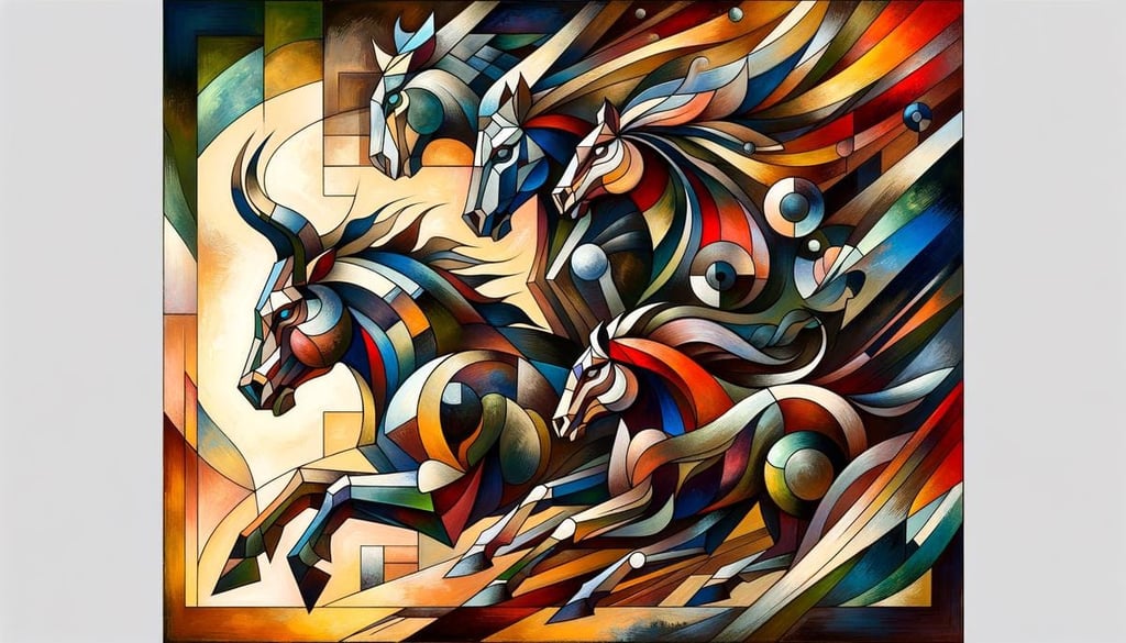 Through technical mastery, Picasso layers elements at varying depths, leading the eye across the canvas in a deliberate choreography of shock and reflection. Guernica's composition—a chaotic entanglement of victims and aggressors—uses juxtaposition to potentiate stark emotional reactions. The bull's calm contrast against the horse's torment casts a dramatic foil set within this calamity. By placing harrowing images alongside calmer counterparts, Picasso underscores the surreal coexistence of daily life with violence.