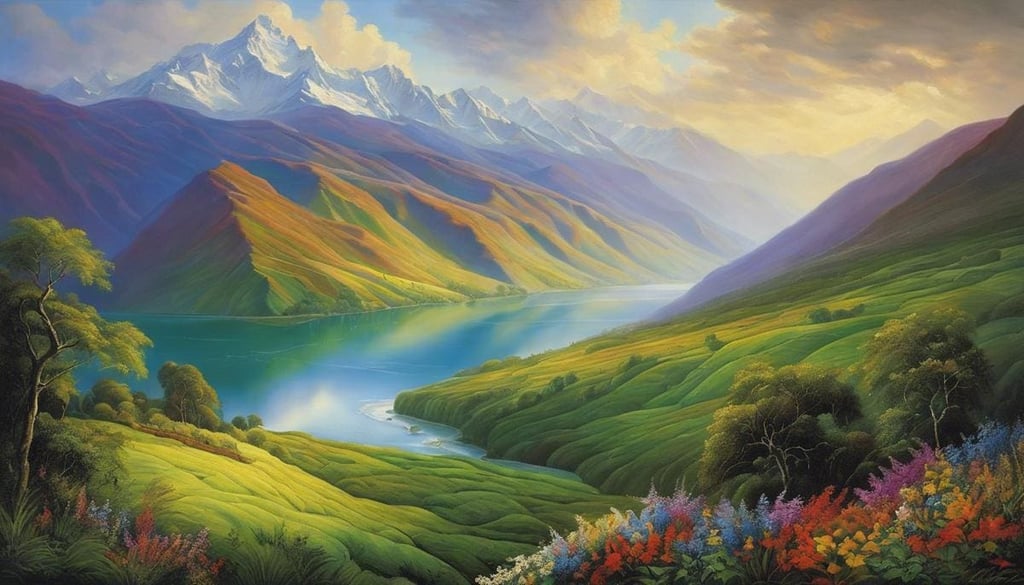 Adventuring further into the painting, he has effortlessly captured the majesty of the mountain ranges, with the broad sweep of the Andes serving as a formidable backdrop. Through his perceptive use of tonal contrast and atmospheric perspective, he has invincibly encapsulated the depth and expanse of the setting and played with light and shadow to articulate the formidable magnitude of the mighty Andes. This innovative technique enables the viewer to virtually breathe the crisp mountain air and immerse themselves in the grandeur of the scene.