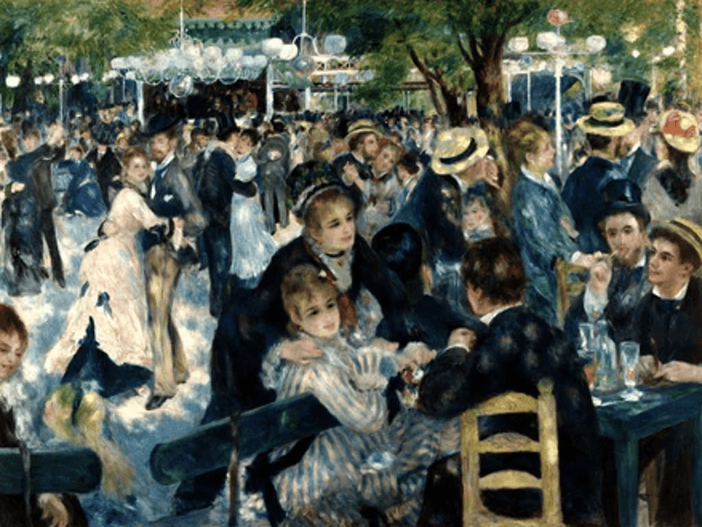 Working-class and student Parisians at leisure on a sunny Sunday afternoon. A scene of joyful exuberance and camaraderie. Artists, companions, couples, friends, wives and lovers engage in swirling carefree, frolicsome dancing in an open-air space fringed with benches, tables and chairs.