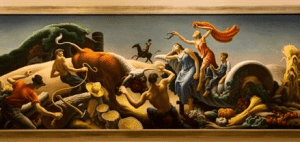 This equine picture is suitable for the renowned Bonaparte Crossing the Grand Saint Bernard Pass by Jacques-Louis David, 20 May 1800. (1800). A young African-American man wears army fatigue, a white bandana, brown boot, red sweatbands on his wrists, and a flowing golden robe over his shoulders in Wiley’s rendition. The composition is the same as David’s masterpiece, with the figure pointing upward on rocky terrain with its tattooed right bracelet. As in the original, the names of the military commanders who led their forces over the alps are carved into the rocks in the lower corner left (“BONAPARTE” “HANNIBAL” and “KAROLUS MAGNUS”), but in Wiley’s rendition, there is an additional name, “WILLIAMS” (Wiley’s saddename) above the other two. Wiley also signed and dated the work on the horse’s breastplate in the same location as David. His backdrop is the beautiful red and gold baroque brocade design of the top three-quarters of the picture. On the backdrop, the deep red pattern shows little white sperm swimming. The artwork is fitted with an adorned gold frame.