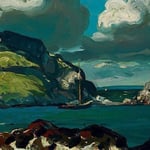 A powerful, evocative image with bold, gutsy, impasto paintwork. This painting by George Bellows depicts a landscape and seascape with craggy rocks, clouds and a…
