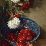 “Cherries and Viburno” by Clara von Sivers, German (1854-1924) painted, 1890 A beautiful cascade of green foliage, delicate white balls of Viburnum flowers, contrasting with…