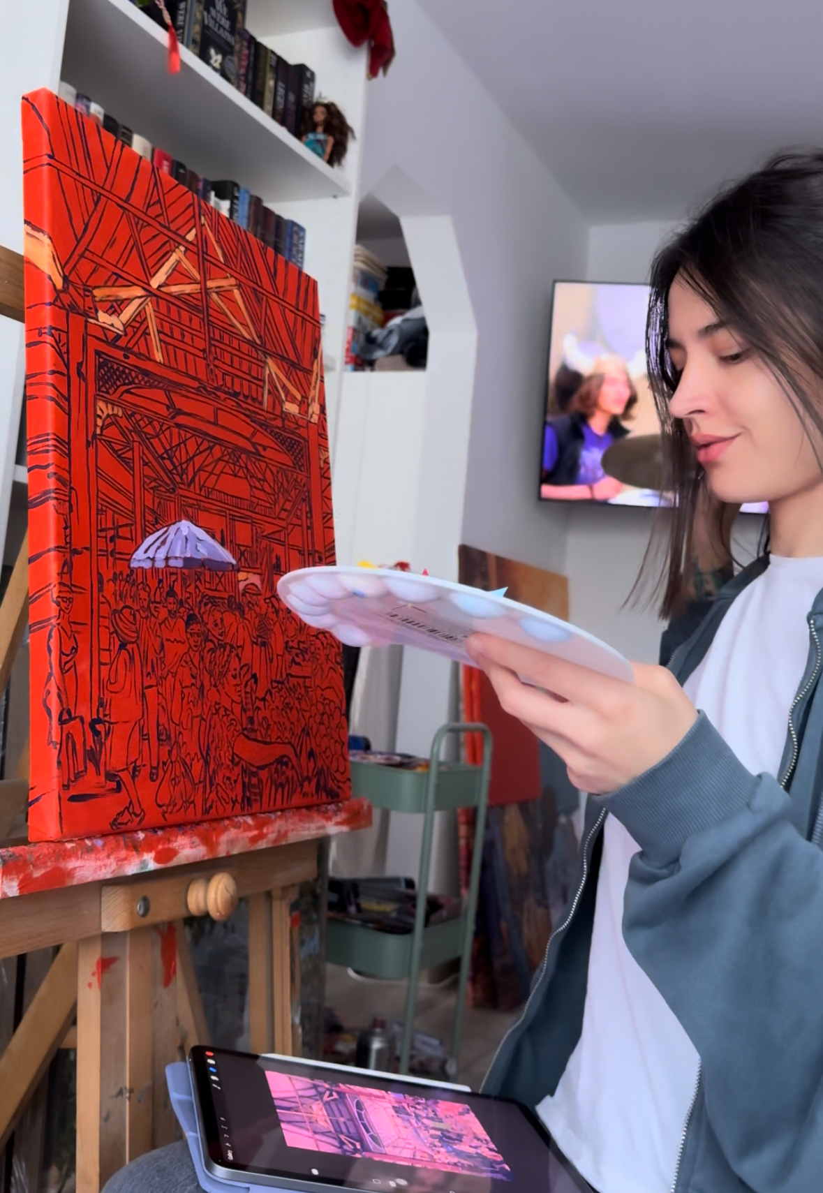 Through my paintings I explore the interaction between the spirit of living beings and the environment. My work likes to capture moments, memories, making them timeless. Each painting is both personal and universal, a story, the endless search for connection. The color palette I use depends on the feeling that the composition inspires me. Most of the times is warm and vibrant, my brushwork evokes movement and emotion, translating the fleeting into the eternal. Each of my works begins with a scarlet red background, a foundation of warmth and pulse, a symbol of the passion and vitality that lives beneath every surface. Over this red I sketch my compositions in ultramarine blue, tracing them with strong lines. As I paint, I build the worlds from front to back, going kind of backwards, allowing the scarlet red to bleed through the layers of color. This process, with is both intuitive and disciplined, reflects the theme of my art: presence, memory and the dynamic between what is seen and what is felt.