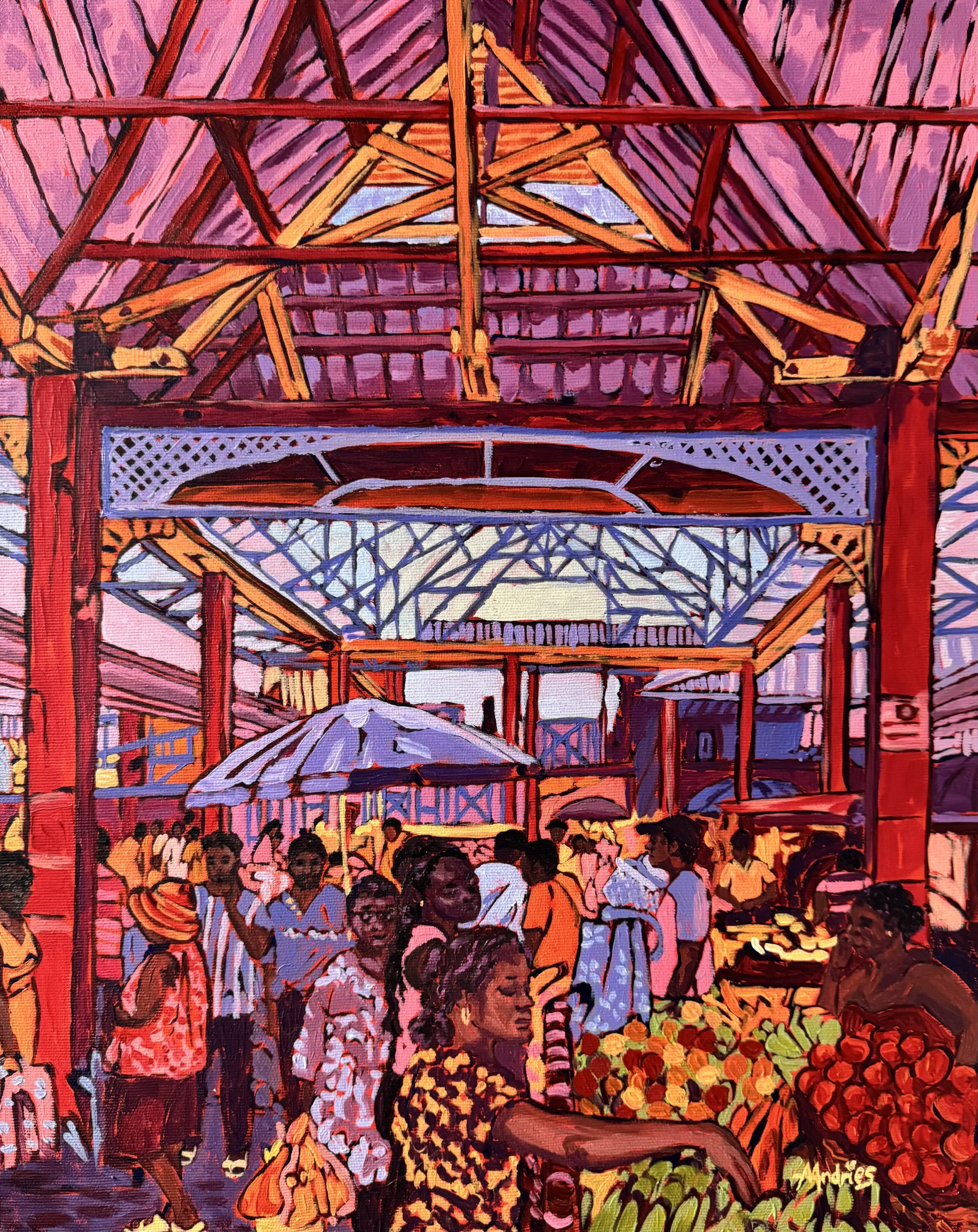 This painting captures the vibrant pulse of everyday life in the market, a place alive with color, rhythm and community. Bathed in warm reds, pinks, and golds, it reflects the heartbeat of the people, their gestures, their laughter, and the intimate choreography of trade and connection. The beams of the roof frame the human energy below, a dance of light and movement. It’s not just a scene, but a memory of warmth, of sun-soaked mornings, of the beauty of a simple life.