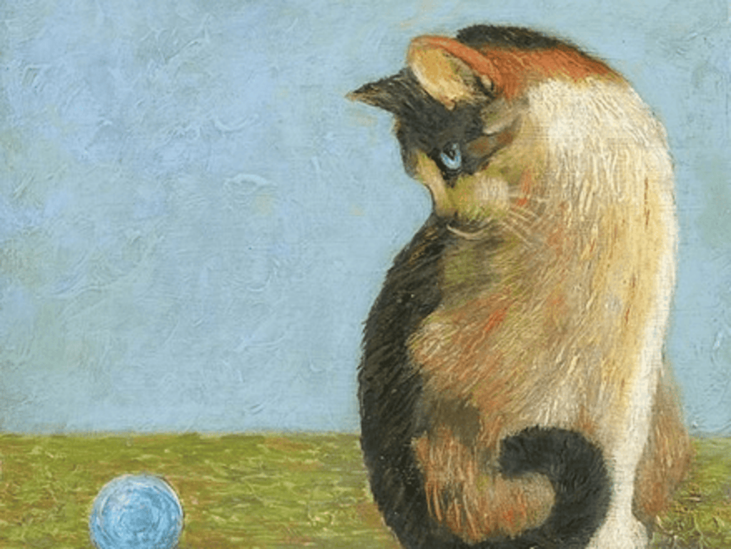 A nice enough, quite charming and calming painting. A cat sits passively, head turned and tail curled, concentrating on a blue ball. Will the cat respond with a playful attack?. The paint is textured and painterly.