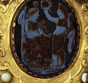 She wears a diaphanous blue garment over a red and white checked Kimono?. On the lower part, she has a light blue garment with paler blue/white leaf and swirl designs with a linear gold design near the edge.