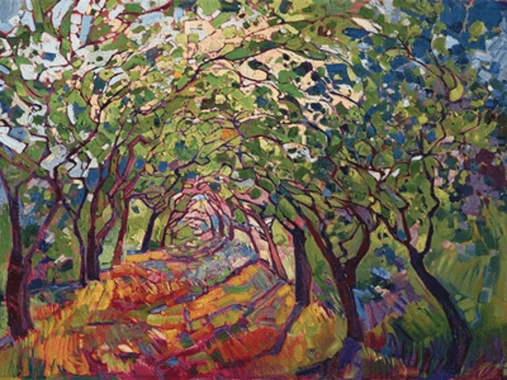 Imagination and beauty await you at the end of this route surrounded with California oak trees. Using free and vivacious brushstrokes, the artist captures a dynamic dance of colour and light among the oak limbs.