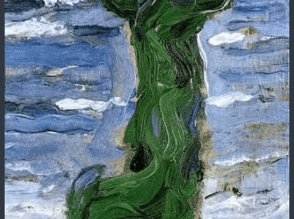 Swirls of raw impasto brushwork give enough information to read and understand the image. One can feel the blustery wind as it whips up the sea and the lady is forced to lean into the wind clutching her hat as her garment billows behind. The dark green dominates the upright close-cropped composition in a simple central position. What a thrilling and exciting period this was, possibly the most exciting, creative period in art.