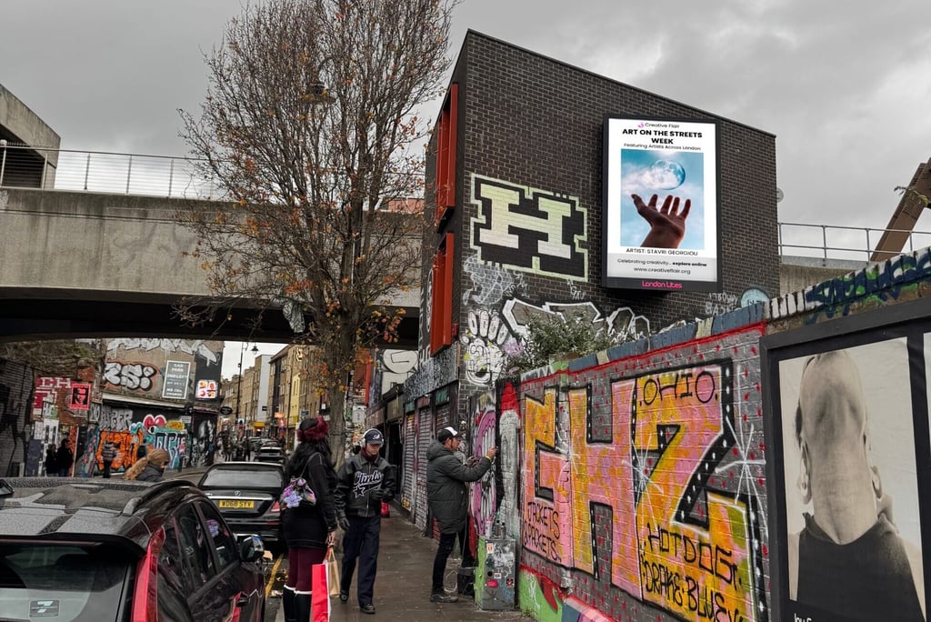A digital screen situated close to the Truman Brewery in the famous Brick Lane, a large entertainment in East London. The street has a very high footfall and is famous as the place to go for a curry and its late-night social scene.